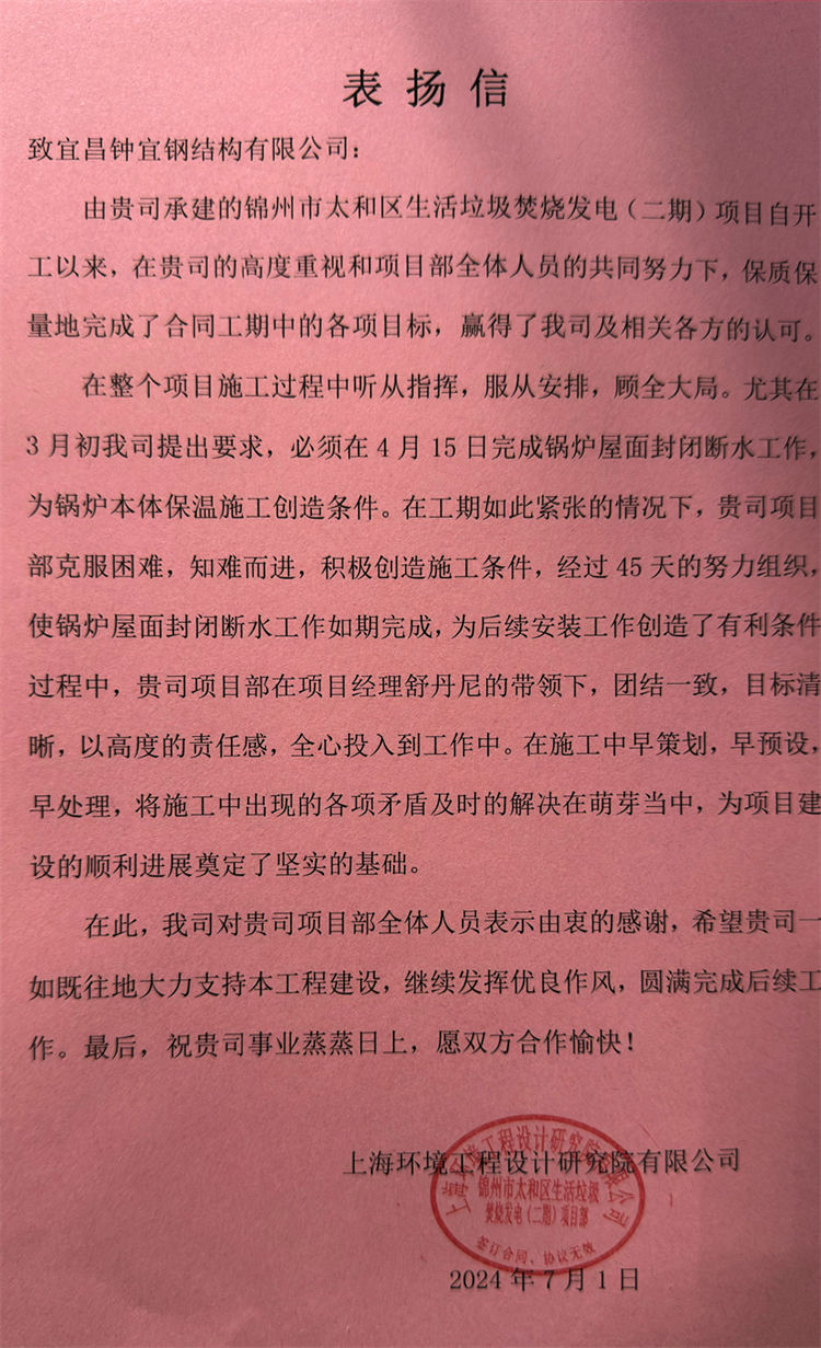 一份付出,一份收获。这封表扬信,折射了钟宜钢构人严谨务实、勤奋进取的工作态度与敬业精神。下一步,公司会始终以匠心践初心,不负信赖,砥砺前行,围绕长远发展、着眼业主利益,用“初心”建立与业主之间良好互信、规范和谐的合作关系,打造精品工程,以不懈努力勇攀钢结构行业的高峰。 |