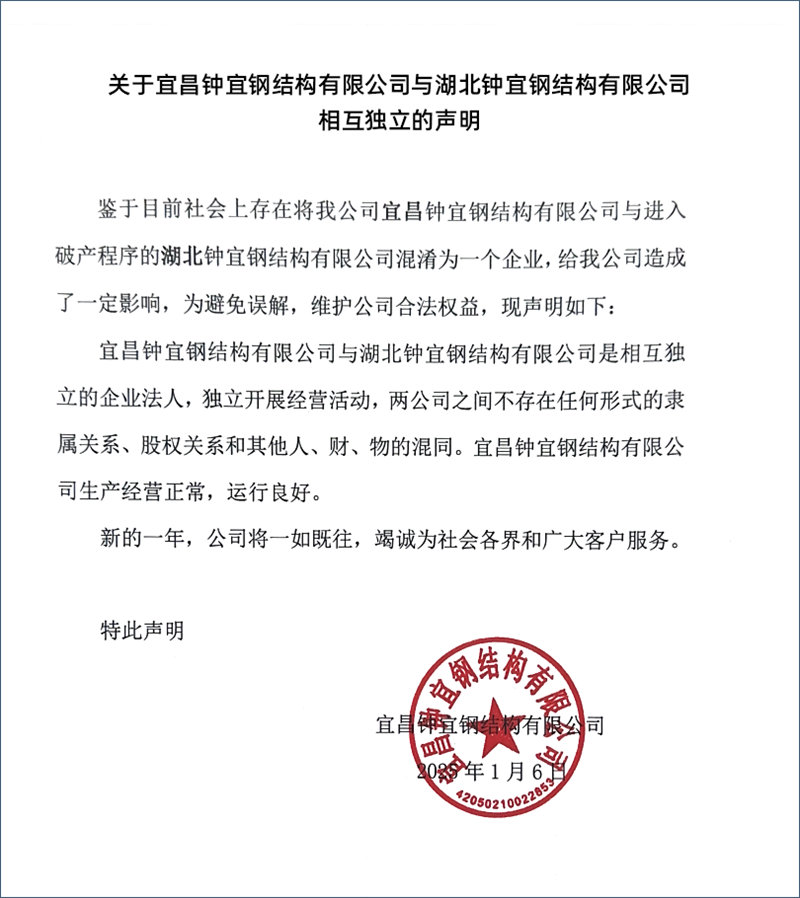 关于宜昌钟宜钢结构有限公司与湖北钟宜钢结构有限公司相互独立的声明 |